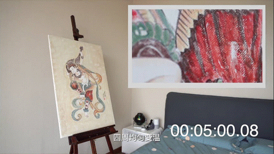 这幅作品是由温感变色的颜料创作的。开启海尔舒适风Pro空调,当温度达到22℃时,原本无色的壁画瞬间均匀变色。雷永锋介绍,如果空调直吹,壁画只能局部变色,能让壁画均匀显色是因为空调的防直吹功能。它也解决了用户不敢直吹空调的问题,空调能精确测算最佳送风角度,吹出自然风。