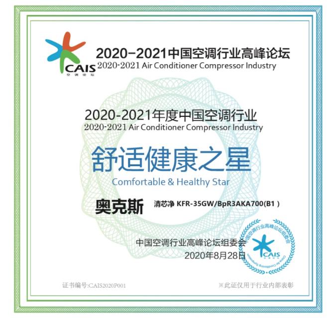 喜讯!奥克斯斩获“2020-2021年度空调行业智能健康倡导者品牌”