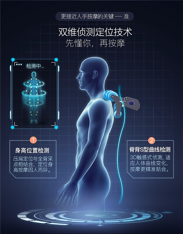 按摩的魅力还在于一个“准”字。OG-7808按摩椅搭载独家专利——双维侦测定位技术,在人体按摩之前,先进行身高位置检测和脊背S型曲线检测,双重检测双重保障。压肩定位与全背采点,代替大师双眼,检测你的身高体型;3D触探侦测,让按摩精准贴合身体曲线,比你更“懂”自己的身体。根据检测结果制定因人而异的按摩方案,让每一次的按摩都变成高级“私人订制”,比肩大师按摩准度,更显其科学优越性。