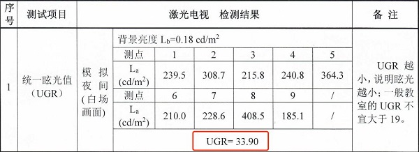 此外,根据专业测试机构对激光电视的统一眩光值(UGR)的测试结果显示,激光电视在黑天暗场环境下的UGR值最高可达到33.9,远远超出UGR=19这个行业公认的舒适区间最高值,甚至突破了UGR=28这个“不可忍受”值。