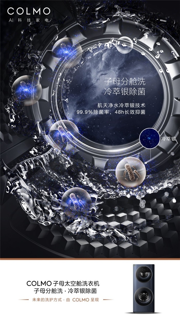 分区就是为了健康,健康就要做到极致!航天太空服内层采用涂银聚酯,能缓慢且稳定释放银离子杀死细菌病毒。航天器内的水系统中的微生物,主要通过在水中添加银离子净除。COLMO以此为灵感,首发业内独创的冷萃银净化科技,通过更加稳定的磷酸盐冷萃银系抗菌晶体的长效缓释能力,达到更低银离子浓度下的更高效杀菌抑菌防护效果,结合航空无菌舱的封闭性能,研发更有效除菌、抑菌的洗护舱体,并应用在双滚筒新品上,形成“宇航级”健康除菌舱,为用户提供真正无交叉感染可能的洗涤新方式!并且COLMO太空子母舱洗衣机搭载了OCDCBLDC高速变频电机,结合悬浮环淋技术,强劲的净纤水流,也把冷萃银离子送到全舱各个角落,从而深入衣物纤维消毒杀菌。舱门顶部的喷淋口进360°的活水喷淋,确保清除泡沫残留,达到真正无死角的净菌保护。实验表明面,可以实现99.9%的除菌率,更可以48小时抑菌,实现从洗涤到晾晒的全流程衣物健康呵护!