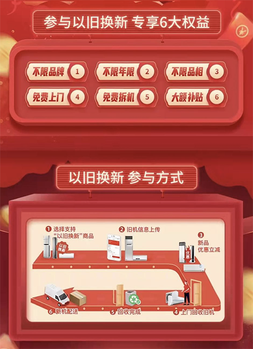 为了让消费者轻松地完成空调以旧换新,京东家电针对以旧换新服务推出不限品牌、不限年限、不限品相、免费上门、免费拆机和大额补贴等6大权益,让消费者可以购买到心仪的品牌,同时免去上门拆机的费用。