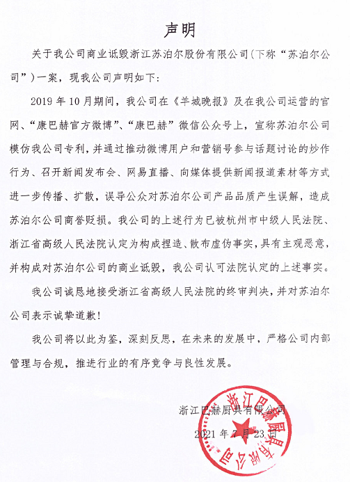 家电消费网看到,生产康巴赫厨具的浙江巴赫厨具有限公司在声明中表示,2019年10月期间,我公司在《羊城晚报》及在我公司运营的官网、康巴赫官方微博、康巴赫微信公众号上,宣称苏泊尔公司模仿我公司专利,并通过推动微博用户和营销号参与话题讨论的炒作行为、召开新闻发布会、网易直播、向媒体提供新闻报道素材等方式进一步传播、扩散,误导公众对苏泊尔公司产品品质产生误解,造成苏泊尔公司商誉贬损。