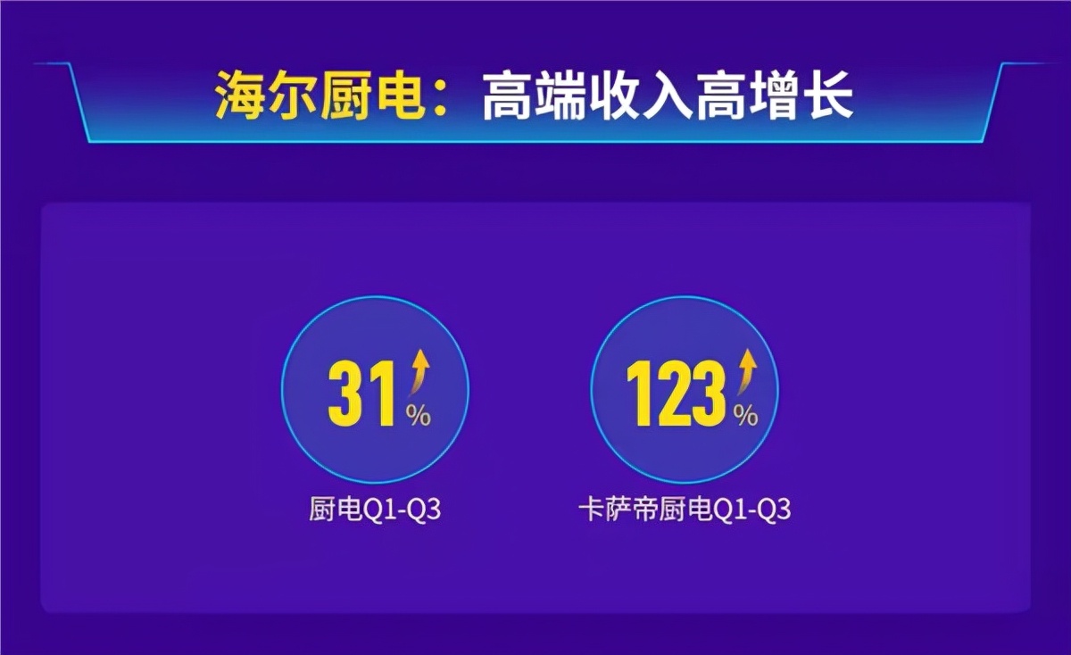 根据海尔智家2021三季报显示,海尔厨电1-9月营收增长31%。这是其自2015年以来,连续增长6年之后再次增长,增速领跑行业。聚焦高端品牌卡萨帝,2021年前三季度实现123%的增长。