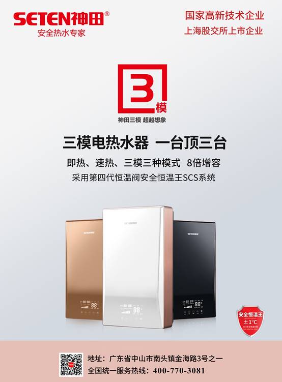 当同行都在思考如何开发更低成本的单模速热、双模速热的时候,神田开发三模电热水器,用即热、速热、三模三种加热模式,充分足满足消费者的沐浴需求。水量更大是消费者的基本需求,所以神田放弃当时同行都在大量使用的16L容量设计,新产品都是 20L以上大容量设计,如今大容量速热式电热水器成为了行业的主流。