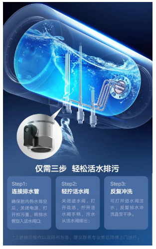 由于储水式热水器的特殊密闭性构造以及工作原理,自来水中的污垢普遍沉积于内胆底部,并且是不会随着日常用水被排出的,这就需要人工来帮助排污。可绝大多数热水器的排污口都是设计给专业售后人员使用,普通用户操作起来很是不便。为此云米互联网电热水器Nano A1专门设计了简易式排污阀,用户只需三步便可轻松将热水器内胆中的污水排出,便于清理的同时也可省下不少的后期维护费用。