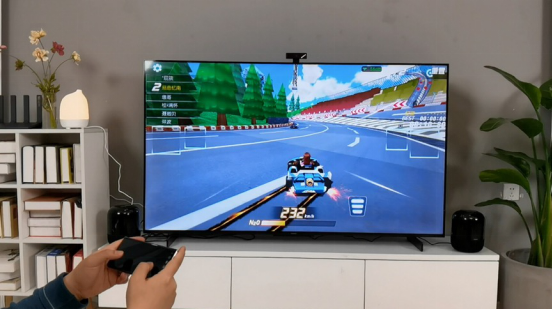 以赛车类游戏为例,在智慧屏的应用市场里可以下载安装游戏,之后根据系统提示,打开手机的投屏功能(我测试用的是华为Mate40 Pro),与手机建立连接后就可以用手机替代游戏手柄来进行操控了。