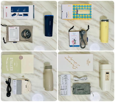 拿到货之后首先要做的就是开箱啦,先来看看四款烧水杯都长什么样子,包含哪些配件吧!