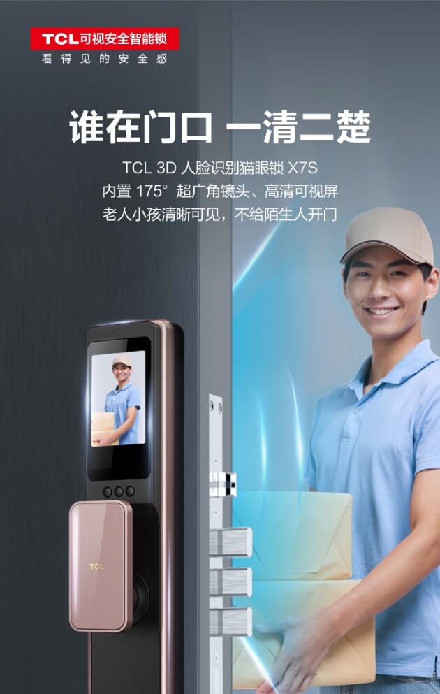 为满足用户需求,TCL率先布局3D人脸识别、智屏猫眼、AI摄像头、全屋家电及手机APP互联互通等创新技术,不仅在功能层面上实现家门口情况的可视化,更重要的是安全层面的可视化,实现用户在外能主动查看家门、与门口访客视频通话、老人小孩在家里能清晰看清楚门外、家门出入情况及异常报警信息及时推送手机等应用场景,让用户随时随地掌握家里安全,带来看得见的安全感。