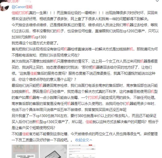 “佳能售后维修店的人员说让我们带着机器过去检修,等我们过去以后,根本没看我们的机器,也没做任何检查,就跟我们说这台机器已停产,只可以加380元买新打印机CP1300。”