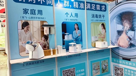 在本次展会上最吸睛当属JOYFACE觉飞推出的新品——心愿仿手微洗机,据相关负责人介绍,这款产品适用于2~3人小家庭的贴身衣物清洁。