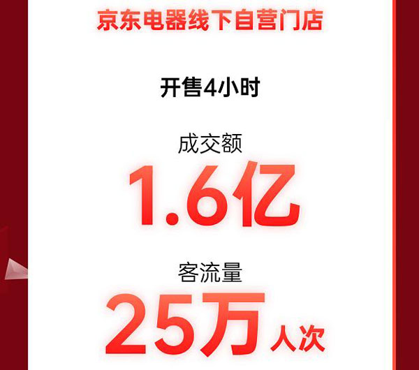 11月10日晚8点,京东11.11正式进入高潮期,线上开抢的同时,线下同样精彩。全国京东电器线下门店晚8点同步开启欢庆之夜,在汇聚新潮产品的同时,还带来一系列精彩的演出和互动体验,引爆消费者的购物热情。数据统计,11月10日晚8点至11月11日0点期间,京东电器线下自营门店4小时成交额1.6亿、到店客流量25万人次,其中,京东电器超级体验店重庆店成交额同比增长109%、到店客流量同比增长超200%,线下11.11大爆发。