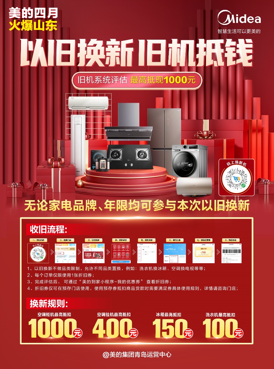 生活中家电使用时间过长,容易产生各种功能性问题,但更为严重的有可能影响人体健康的问题。能耗高、不环保也是比较头疼的问题。以旧换新,健康升级,值此火四月,以旧换新玩法升级,以空调、冰箱和洗衣机为主,不限品牌,不限年限,美的低碳绿色回收,用户可享最高抵1000元的尊享福利。