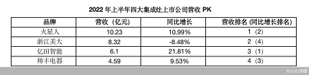 北京商报记者梳理发现,与2021年半年相比,四大集成灶上市公司按照营收排名没有变化,仍然是火星人位列第一,其次分别是浙江美大、亿田智能、帅丰电器。