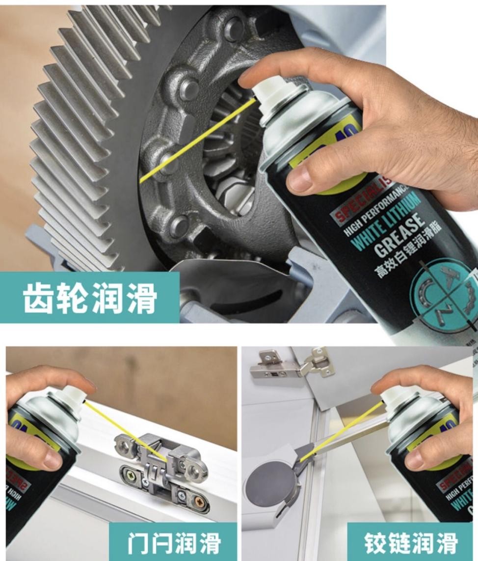 WD-40高效白锂润滑脂的工作温度范围为-73℃至+260℃,适用于金属、塑料、橡胶及乙烯基树脂,可用于皮带、轴承、联动装置、工具、滑轮、导轨、锁具、门铰链、阀门、起重机、输送带、模具等。更加值得一提的是,在金属部件喷涂WD-40高效白锂润滑脂后,金属表面还会形成一层白色的厚油膜,在对金属提供润滑保护作用的同时,还能防止表面生锈,隔绝潮湿,防止灰尘、细小杂质附着表面。