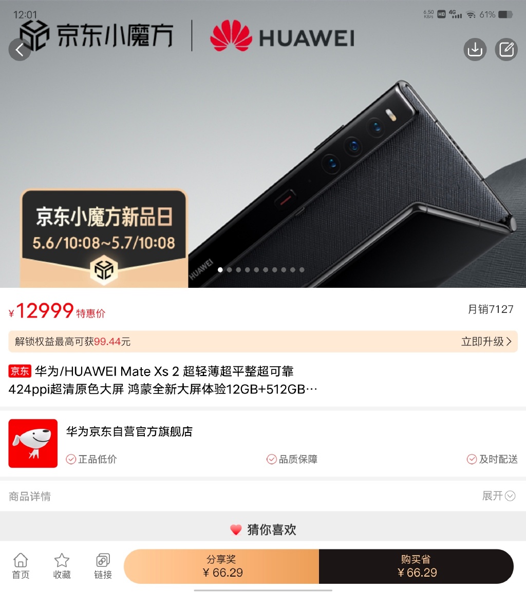 家电消费网看到京东商城销售的华为Mate Xs 2(12GB+512GB)售价12999元,售出7127台后显示无货。
