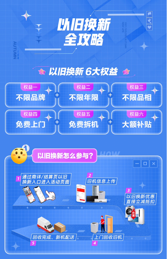 随着大家的生活水平提升,消费者需求也逐渐个性化、多元化。面对以旧换新过程中旧家电难回收、难搬运等问题,京东优化以旧换新服务流程,支持取旧送新同步。新家电由京东工作人员送到家,再逐步完成安装、拆旧机、回收等环节,帮消费者节省空间与时间。面对居民不同的居住环境,无论是六七层没有电梯的居民楼,还是重量近100公斤的双开门冰箱,京东家电都坚持贯彻免费上门、免费拆旧、免费搬运的“三免”政策,让用户以旧换新无后顾之忧。