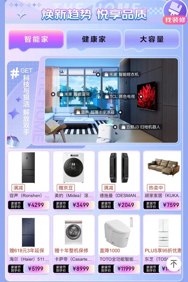 对于年轻人来说,家不仅是一个居住的场所,更是一个能够带来快乐与舒适感受的地方。近年来,年轻人对家居空间个性化需求越来越强烈,对不同空间的装饰和布置都要融入自己的个性与喜好。比如,没有噪声的卧室,电器齐全的厨房,娱乐放松的客厅等等。为此,京东家电家居秋季家装节针对卧室、卫生间、客厅、厨房四大场景推出了厨房改造、小家扩容、童趣改造、适老改造、健康家、智能家、大容量等14个趋势场景,让消费者可以根据自身偏好,一站式购齐心仪的产品。