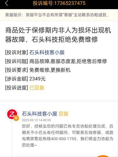 该消费者还表示,产品出现问题,找到石头科技售后,才被告知进蟑螂不在保修范围内。可是,在购买时石头科技并没有清楚的告知用户,哪些不保修需要收费。“交易快照里只字未提维修相关事宜,产品说明书也并未提及进虫不保修。如果你们在购买详情里说明了保修相关事宜我绝对不会购机,买回来以后坏了就拿出霸王条款这不修那不修。”