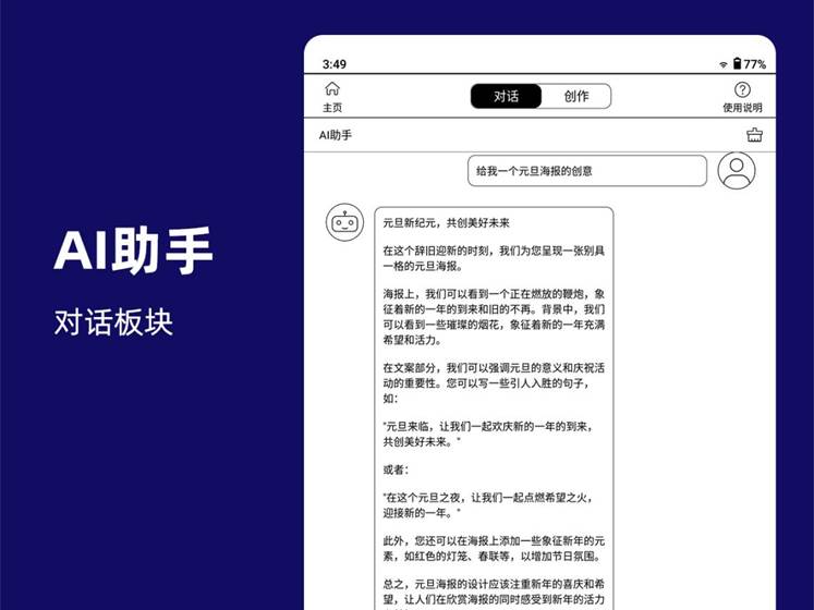 搭载天地大模型的汉王手写电纸本提供的AI助手功能,可以让用户直接与之对话,AI助手会根据上下文分析问题作出正确回答,并且可以完成所有通用场景下的问答对话,甚至能完成撰写邮件、视频脚本、翻译、代码、写文章等复杂任务。另外,汉王手写电纸本上的AI对话功能覆盖广阔的知识领域,无论用户提问的是技术问题、行政事务、产品使用指导还是其他领域的问题,汉王天地大模型都可以提供准确的回答。而且在汉王电纸本上,无论是阅读还是语音记录等模块,AI助手可以均可使用,让你随时随地感受到AI的智能和趣味。