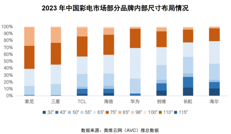 同时,基于用户对大屏电视的喜爱,各大厂商也在这个赛道投入大量产品研发精力。索尼、三星等外资品牌内部75吋及以上电视占比均超过50%, 而TCL、海信、华为、创维、长虹、海尔等品牌的内部占比皆高于20%。