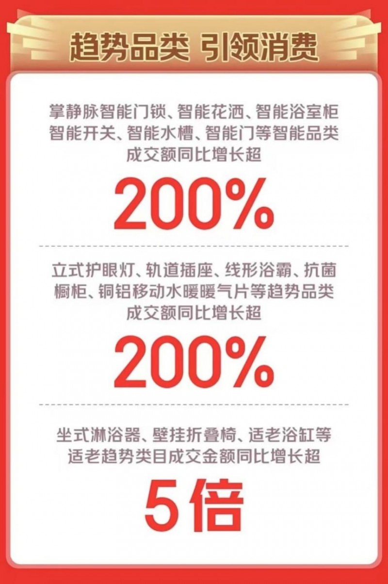 智能焕新、温暖过冬、适老改造成为建材换新三大热门趋势。京东11.11开门红期间,掌静脉智能门锁、智能花洒、智能浴室柜、智能开关、智能水槽、智能门等智能品类成交额同比增长超200%,立式护眼灯、轨道插座、线形浴霸、抗菌橱柜、铜铝移动水暖暖气片等趋势品类成交额同比增长超200%,坐式淋浴器、壁挂折叠椅、适老浴缸等适老趋势类目成交额同比增长超5倍。