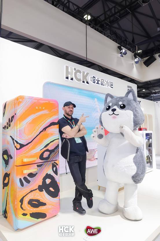 舞台左侧摆着一台充满艺术感和线条美感的复古冰箱,与周围产品的配色形成鲜明对比,这便是马其顿知名视觉设计艺术家Daniel Kocev Pazamat利用HCK哈士奇小香风Max,专门为AWE展会HCK哈士奇冰吧创作的艺术作品。