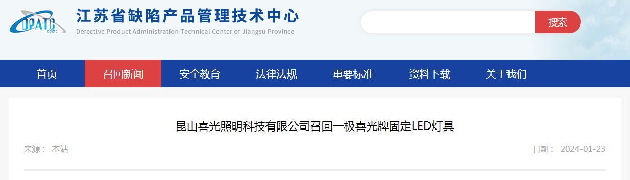 家电消费网1月26日讯 昨天,江苏昆山喜光照明科技有限公司按向江苏省市场监督管理局和昆山市市场监督管理局报告了召回计划,自即日起,召回2023年7月1日制造的一极喜光牌XGXT-016A型固定LED灯具,涉及数量为17只。