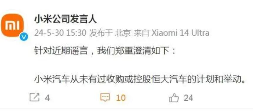 家电消费网5月30日讯 今天,小米公司发言人在微博发布声明称,小米公司发言人在微博发声称,针对近期谣言,我们郑重澄清如下:小米汽车从未有过收购或控股恒大汽车的计划和举动。