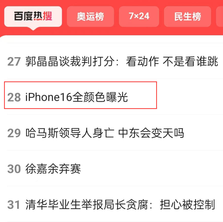 家电消费网7月31日讯 今天,“iPhone16全颜色曝光”冲上百度热搜。