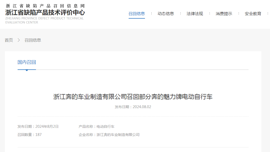 家电消费网8月8日讯 昨天,浙江奔的车业制造有限公司主动向浙江省市场监督管理局和台州市市场监督管理局报告了召回计划,将自即日起,召回 2022年10月20日至2023年7月26日期间制造的部分奔的魅力牌TDT0013Z型号电动自行车产品,涉及数量为187辆。