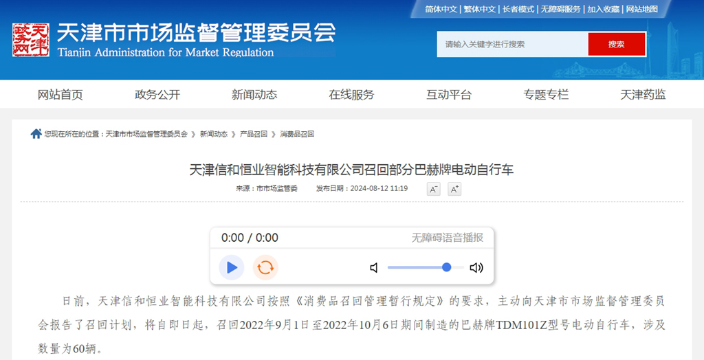 家电消费网8月13日讯 昨天,天津信和恒业智能科技有限公司主动向天津市市场监督管理委员会报告了召回计划,将自即日起,召回2022年9月1日至2022年10月6日期间制造的巴赫牌TDM101Z型号电动自行车,涉及数量为60辆。