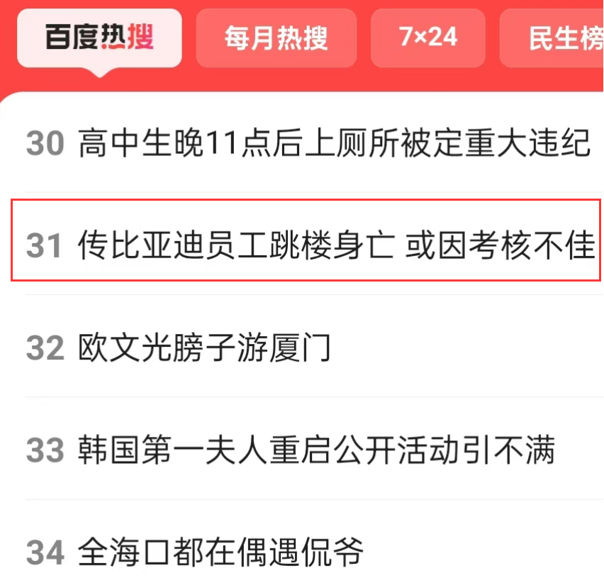 “传比亚迪员工跳楼身亡 或因考核不佳”冲上百度热搜