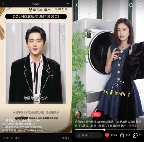 而在站外,COLMO在小红书、抖音、微博等多平台进行种草推广。不但联动了明星颖儿及张新成进行口播造势,引爆了”娇奢洗护”话题热度;在抖音和小红书还联合了多位达人集体宣传,结合产品核心卖点做内容营销,通过口碑种草助力消费者决策,为新品销量爆发蓄水。还联合了10个以上的高端服饰品牌联动造势,通过蓝V互动+门店联动+私域社群的方式进行宣发,实现线上线下同步曝光,并将种草人群引流至京东,实现最终的收割。在站内外的多渠道营销之下,COLMO北极星洗护套装C2成功引爆了声势,总曝光量突破1.2亿,互动数超42.6万,开售28小时品牌销量超2600台,还登上了洗护行业TOP1,成功实现首发即卖爆。