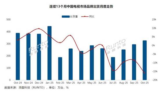 事实上,这一局面早有迹可循。根据洛图科技9月份数据,中国电视市场出货量292万台,同比下滑8.5%,但海信、TCL、创维三家却拿走了181万台,占比62%,同比仅微降0.5%;而中小品牌(长虹、海尔、康佳)出货44万台,同比大跌14%。最新发布的10月数据,依然维持这一格局,尽管双11对中小品牌出货量有一定刺激,但微乎其微,长虹、海尔、康佳等其他主要品牌合计出货量仅为50万台,同比下降9.8%,三者总和不及小米一家。