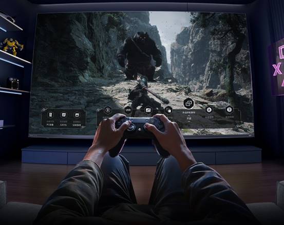 以100吋E7Q为例,4K 170Hz原生高刷打底,最高可实现330Hz刷新率,细腻画质与丝滑流畅兼顾。玩《黑神话:悟空》这类大型游戏时,无论是孙悟空的金箍棒高速挥舞,还是Boss战的激烈特效,都帧帧清晰无拖影,连招操作零延迟,真正“手眼同步”,爽感拉满。就连对操作要求极高的FPS游戏,330Hz疾速刷新也能帮上大忙,每秒比普通电视多呈现42帧画面,不仅敌人的移动轨迹清晰可见,遭遇闪光弹时还能提前几毫秒摆脱白屏,抢占制胜先机。看动作大片时,体验更堪比影院黄金座,追车戏里车轮摩擦的火花、拳拳到肉的打斗场面,都真实得仿佛要溢出屏幕。