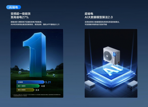 传统多联机在多个房间同时开启时往往耗电显著,电费支出成为不少家庭的困扰。尤其在换季时期,空调长时间运行更易导致电费攀升。针对这些痛点,TCL真省电小多联全新升级8极12槽双转子压缩机(上一代小多联压缩机为6极10槽)和电子膨胀阀,内外机采用全直流变频系统,实现变频超一级能效,APF值达5.21,较国标三级能效节省电力最高达27%。同时搭载超省电AI大数据模型算法2.0,采用自研大数据模型和多联机舒适控制算法,实现制冷制热运行实时节能,不断提升能效表现。