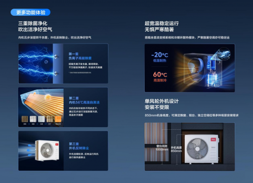 此外,TCL真省电小多联还具备三重除菌净化科技,包括负离子高能除菌、内机56℃高温自清洁、外机自动除尘三重净化科技,从根本上保障家中空气洁净。其搭载全直流变频系统和冷媒环散热模块,能实现超宽温稳定运行能实现60℃高温制冷,-20℃低温制热,无惧严寒酷暑。