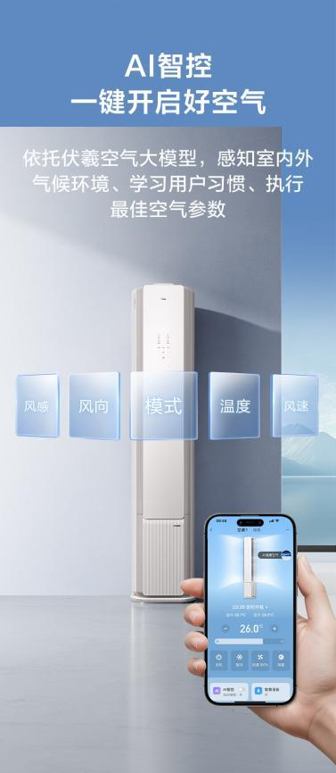 双出风口独立控制更是一大亮点,实现了分区送风。用户可以根据家庭成员的不同需求,调节左右出风口的柔风模式。老人怕直吹,就可以将老人所在区域的出风口设置为柔和送风;宝宝需要避开冷风,也能轻松实现。环抱附壁流技术则让气流贴壁环绕,冷热均匀送达每个角落,营造出凉而不冷、暖而不燥的舒适环境。通过「AI智控」一键开启好空气,立刻就像置身于大自然中,微风轻拂,惬意无比。
