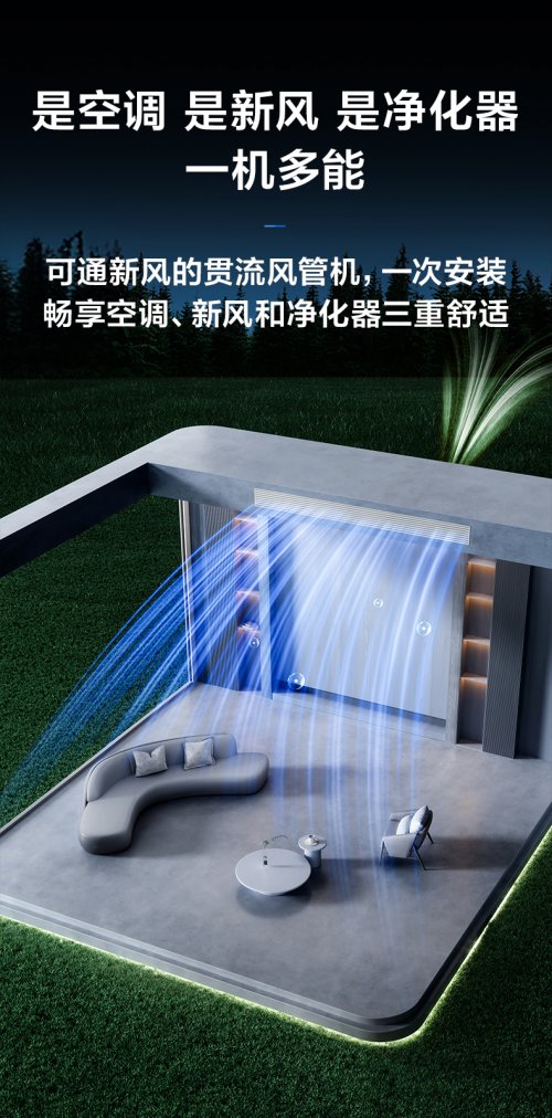 而高端子品牌“小蓝翼”旗下的另一产品,小蓝翼P7新风风管机更是将空调、新风、净化器三者能力融合为一,实现一机多能,一次解决空气问题,实现全屋净化新风,为用户带来健康空气。