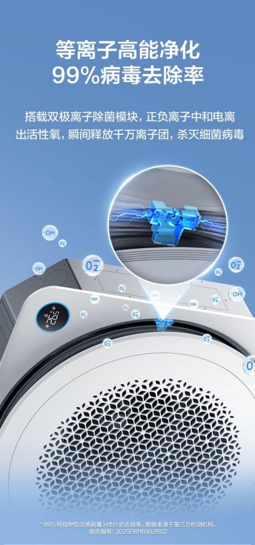 在技术层面,小蓝翼天花机延续了小蓝翼系列标志性的AI健康技术优势,并实现与天花机产品特性的深度融合。该产品搭载双极离子除菌模块,正负离子中和电离出活性氧,瞬间释放千万离子团,可实现99.9%的病毒去除率,从源头保障室内空气健康,为用户打造一个清新、安全的室内环境。