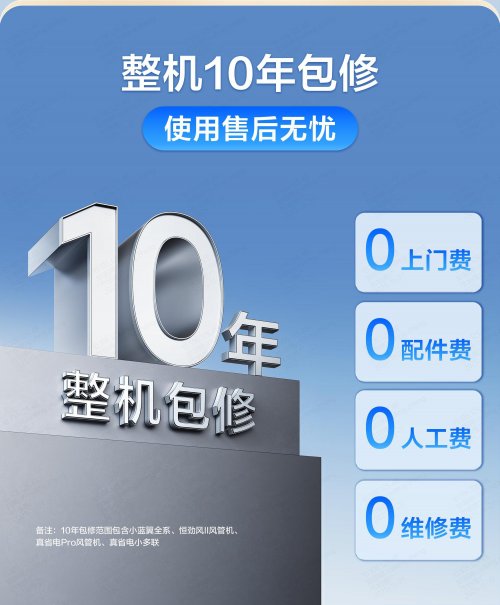 值得关注的是,凡是购买小蓝翼系列家庭中央空调的用户可尊享小蓝翼专属VIP服务权益 —— 整机10年包修保障(免上门费、免配件费、免人工费、免维修费)福利。质保期内,内外机任何质量问题均0付费维修,彻底消除用户后顾之忧。