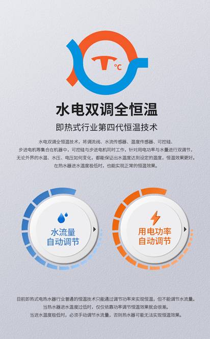 水电双调全恒温技术,将调流阀、水流传感器、温度传感器、可控硅、步进电机等集合在机器中,针对用电功率与水量进行自动双调节,无论外界的水温、水压、电压如何变化,都能保证出水温度达到设定的温度,恒温效果更好。