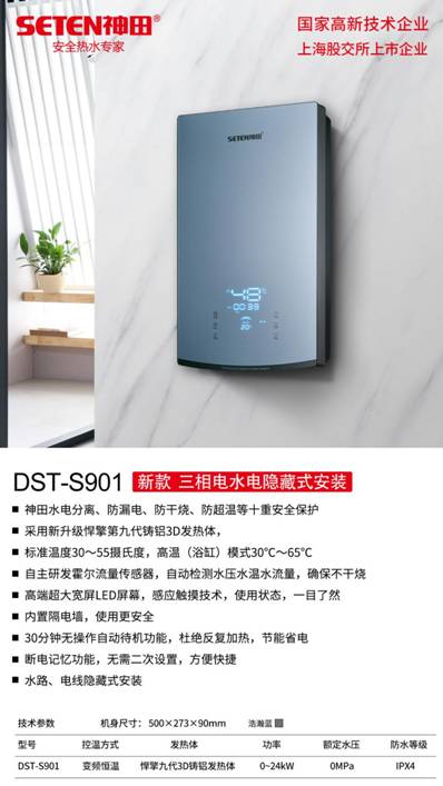 这几年,随着中国城市电力条件的快速提升,越来越多的地方三相电产品销售火爆。因为三相电即热式产品可以即开即热,水量可以洗浴缸,体积小巧且可以隐藏式安装,受到众多高端用户的喜欢。神田集团这几年也一直在开发系列的高端产品,此次推出的S901也是高端产品之一。