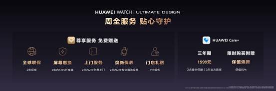 购买HUAWEI WATCH ULTIMATE DESIGN非凡大师紫金款即可获得五大尊享服务 ,其中包含购机享全球联保,2年维保、到店即享门店VIP礼遇 、2年2次免上门服务费、2年1次5折换屏和2年2次免费焕新保养服务,搭配购买HUAWEI Care+综合保障服务产品,为您提供3年2次意外保障及3年官方质保,多重守护,加倍安心;并且还限时(2026年6月30日之前)赠送保值焕新权益。权益生效之日起两年内若原设备满足保值焕新回收标准,即可享受原设备在购买时的官方建议零售价的50%折抵优惠,购买HUAWEI WATCH ULTIMATE DESIGN非凡大师同系列新机(不含本机,不含Ultimate非凡探索系列)。