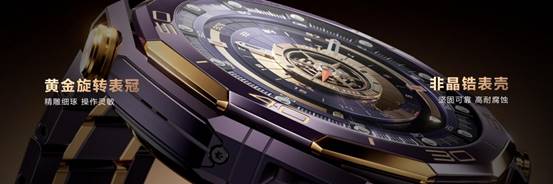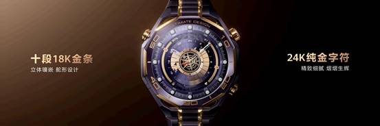全新HUAWEI WATCH ULTIMATE DESIGN非凡大师紫金款以极致材质与非凡工艺树立高端智能手表设计新标杆。表圈采用业界首创的复合稀土紫色陶瓷配方,经过1400℃高温煅烧成紫,纯手工镶嵌6段18K黄金金条,紫金相彰诠释高贵非凡格调。表壳采用独特镂空设计的全新非晶锆合金材质,历经精密铣削与多重打磨,成就坚固抗蚀、质感卓绝的非凡基底。