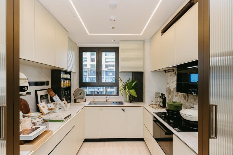 走进西北首个中海“好房子”——中海·锦业拾光项目的样板间,针对西安当地重油烟、高温等厨房痛点,项目联合方太集团,采用了集成烹饪中心和集成净洗中心。例如,通过以超薄低吸设计源头拦截油烟,破解“做饭如蒸桑拿”的长期困扰。在空间利用上,通过水槽与洗碗机的一体化设计,实现了操作动线优化和约85%的空间利用率。