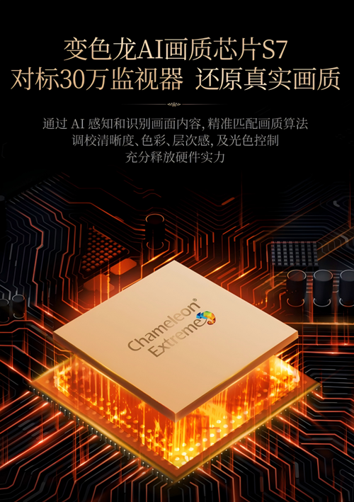 而变色龙AI画质芯片S7则是变色龙显示技术平台利用强大算力、实现场景理解与画质重构的“大脑”。它以“还原真实”为目标,拥有全行业最高的2.5T综合AI算力。通过对画面内容的深度理解,这颗芯片像一位艺术修复师一样,能为每一帧画面匹配最合适的画质算法,精准调校清晰度、色彩、层次感,以及光色控制等参数,从而充分释放硬件的潜力,最终呈现出媲美30万元专业监视器的自然真实画质。