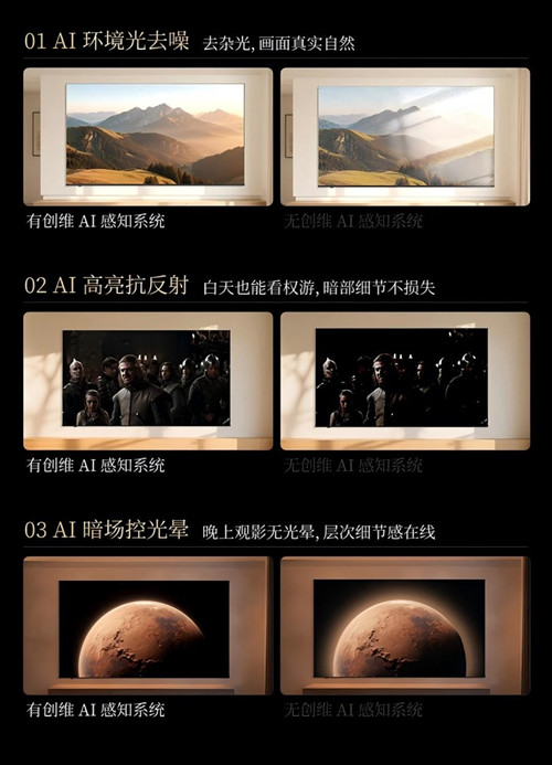 即便电视拥有了完美的控光和算力,观影体验依然会受到环境光因素的影响。创维变色龙显示技术平台行业首创的AI环境感知系统,以环境光的动态变化为基准,进行自适应的画质优化。通过高精度光感芯片和先进算法,它不仅能精准识别从0到100000lux的宽广环境照度,更能有效削弱环境光干扰,确保电视能获得最真实的环境数据。