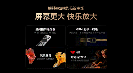 此外,星闪电视2.0搭载鸿鹄音画技术,可以智能优化对比度、色彩与细节,呈现鲜活真实的画面;配合鸿鹄音效2.0,增强人声对白与虚拟环绕声,打造立体沉浸的视听体验,全面升级家庭场景下的交互与娱乐品质。